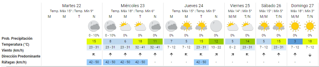 Además, la intensidad del soplido será mayor entre miércoles y jueves, con la posibilidad de ráfagas de hasta 50 kilómetros por hora.