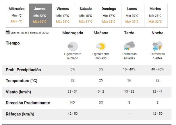 La jornada estará acompañada por el cielo ligeramente nublado y cerrando con tormentas fuertes, que perdurarán durante todo el viernes. La máxima del jueves será de 36°C mientras que para el fin de semana se prevé que oscile entre los 21 y 28 grados.