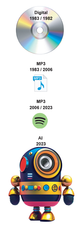 Música gratis para el mundo… todos los autores, todas las canciones en la nube llamada: internet. Unas 500 canciones entraban sin ningún problema en formato MP3 en un CD de compu y estas podían reproducirse en el estéreo del auto, todo ordenado por carpetas secuenciales o dispuestas para la función aleatoria. No más cajas guardando 12 temas de un solo autor. Para 2014 ya no existían ladrones de estéreos. Diez años después (2023) música artificial /que hacen AI / que suena aterradoramente bien. Las máquinas compondrán canciones solo para ti; basada en los play list que escuchas en spotify. Pero es que hay más miedo ahí: estas nuevas AI pueden / ser humano mediante (por ahora) / hacer cantar a Elvis Presley, el tango “Volver” en ritmo de Bachata; a Freddie Mercury cantar una canción de “la mona Giménez” al ritmo de jazz, con un español cuestionable. Un nuevo mundo hoy es posible, para algunos aberrante, para otros; fascinante. El volumen de autores, intérpretes, pinchadiscos, disc jockey, orquestas, cuartetos de géneros diversos, etc… se ha vuelto inmanejable. Hoy es posible escuchar una canción nueva todos los días, sin repetir, por el resto de tus días, se tenga la edad que se tenga. La pregunta ahora es: ¿desaparecerán los grupos de Rock and Roll? La respuesta es: No. Tampoco lo harán los de folklore. Pero de ninguna manera, estos grupos se convertirán en estrellas como lo fueron en su momento los Beatles o los Rolling Stones. Que las cosas cambien es la clave de todo. Es el motor que hace girar la rueda. La otra alternativa posible, es quedarse viviendo en el pasado como un conservador atolondrado… con velas para iluminarse, con caballos para trasladarse, sin heladera o teléfonos; sin supermercados, hospitales y todas las maravillas que esos lugares tienen dentro. ¡Imagine cuál sería su única oportunidad de escuchar música! Un trovador, que visita su triste casa de adobe, paja y palo, con su normal hábitat de vinchucas, una vez al año para cantarle apenas 2 canciones a cambio de un plato de sopa y cobijo por la noche. Yo no quiero eso; ¿Ud? ¿No es acaso más fantástico tener toda la música del mundo (de todas las épocas) en su bolsillo para disfrutarla sin que se desordenen? El cambio nos angustia, pero a estas alturas no es factible movernos sin él. Entonces, qué pasa con los Beethoven, los Mozart, The Cure o los Charly Garcías… voy a sugerir algo que tal vez encuentre una violenta oposición: Los productos de la emoción humana en el arte, filosofía, política, música, literatura etc… son interpretaciones del mundo, que dicen más de la persona que los ejecuta, que del mundo del que está hablando o cantando. Son visiones del mundo de segunda mano, hechas de tercera mano, bajo nuestra propia interpretación emocional como grupo social. Una obra de arte lo es, cuando el grupo humano la reconoce como tal. Y en el fondo, no es una verdad en sí misma. Este es el verdadero miedo; que una máquina tenga la capacidad de ejecución, el poder de mentir o distorsionar la realidad de una forma poética, magnífica y agradable (o debo decir: *estética). Una caja musical a la que cualquiera pueda darle cuerda, con la variante de una melodía nueva, cada vez. Los núcleos sociales que escuchan música (público) en la provincia pasaron de uno -1- (en 1925) a doscientos cincuenta -250- (en 2023) ¿cómo es posible gestionar esto? ¿Cómo alimentar esos oídos insatisfechos? La única forma de hacerlo está frente a sus narices: las AI. No hay vuelta atrás en esto, ya que el espacio del “Templete” de la Plaza 25 de Mayo está ocupado hoy por la estatua de Fray Justo Santa María de Oro. Desde 1950 que una banda no va a tocar ahí los domingos por la tarde y sin embargo, las músicas siguen sonando en el aire de la plaza… y es posible escucharla; por supuesto, si Ud. tiene wifi.