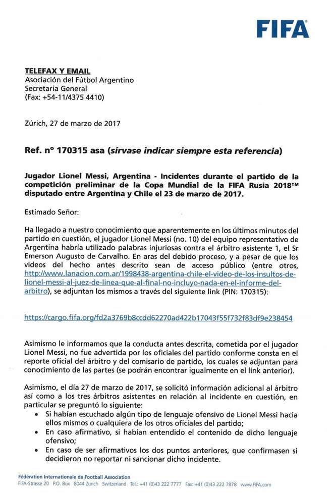 "El jugador Lionel Messi habría utilizado palabras injuriosas", reza el documento. "La conducta antes descripta… no fue advertida por los oficiales del partido", continúa.