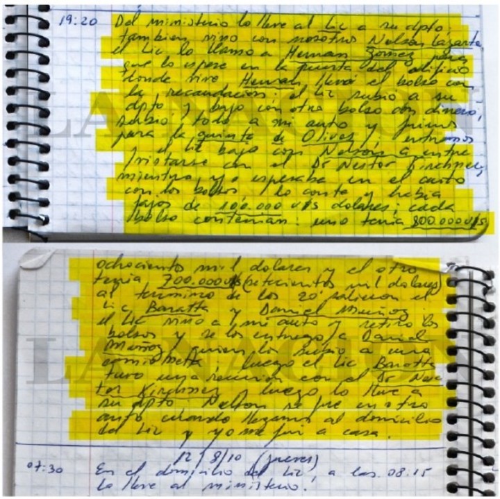 “Fuimos para la Quinta de Olivos, entremos y el Lic. Bajó con Nelson Lazarte a entrevistarse con el Dr. Néstor Kirchner”, continua la narración realizada en puño y letra de Centeno durante los casi 10 años en que se llevó a cabo la recaudación. A partir de sus detallados escritos es que se pudo establecer el traslado de más de U$S 160 millones. “Uno contenía U$S800.000 y en el otro había U$S 700.000”, detalló en ese momento.