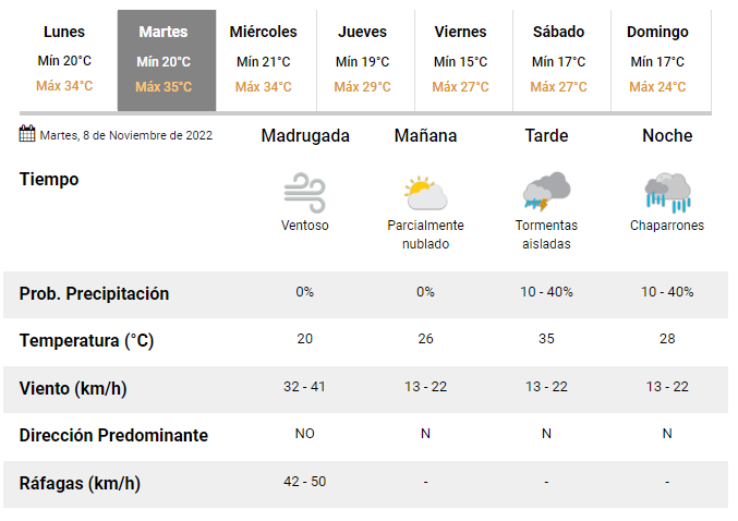 Mientras que, para la mañana del martes se espera una temperatura mínima de 20 grados y una máxima de 35 grados, con tormentas aisladas durante la tarde y chaparrones durante la noche.