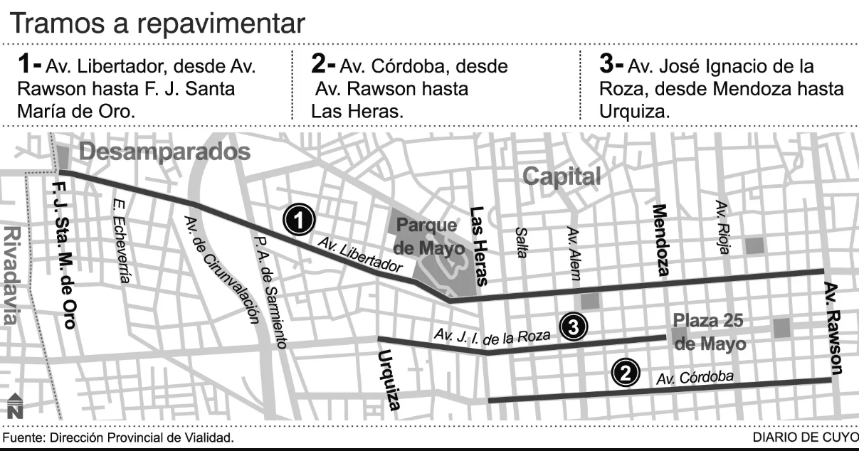 El proyecto difundido indicaba que, la repavimentación se realizará en Avenida Libertador desde Avenida Rawson hasta la plaza de Desamparados; Avenida Ignacio de la Roza, desde calle Mendoza hasta Urquiza; y Avenida Córdoba, desde Avenida Rawson hasta calle Las Heras”.