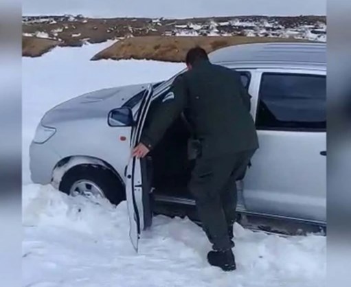Las inclemencias presentes sobre la ruta provincial por acumulación de hielo y nieve motivó el uso del vehículo Unimog que posee la fuerza con el fin de recorrer el trayecto desde el Paraje "Kilka" al Paraje "Litrán" con el apoyo del personal del Grupo Especial Alta Montaña de la institución.