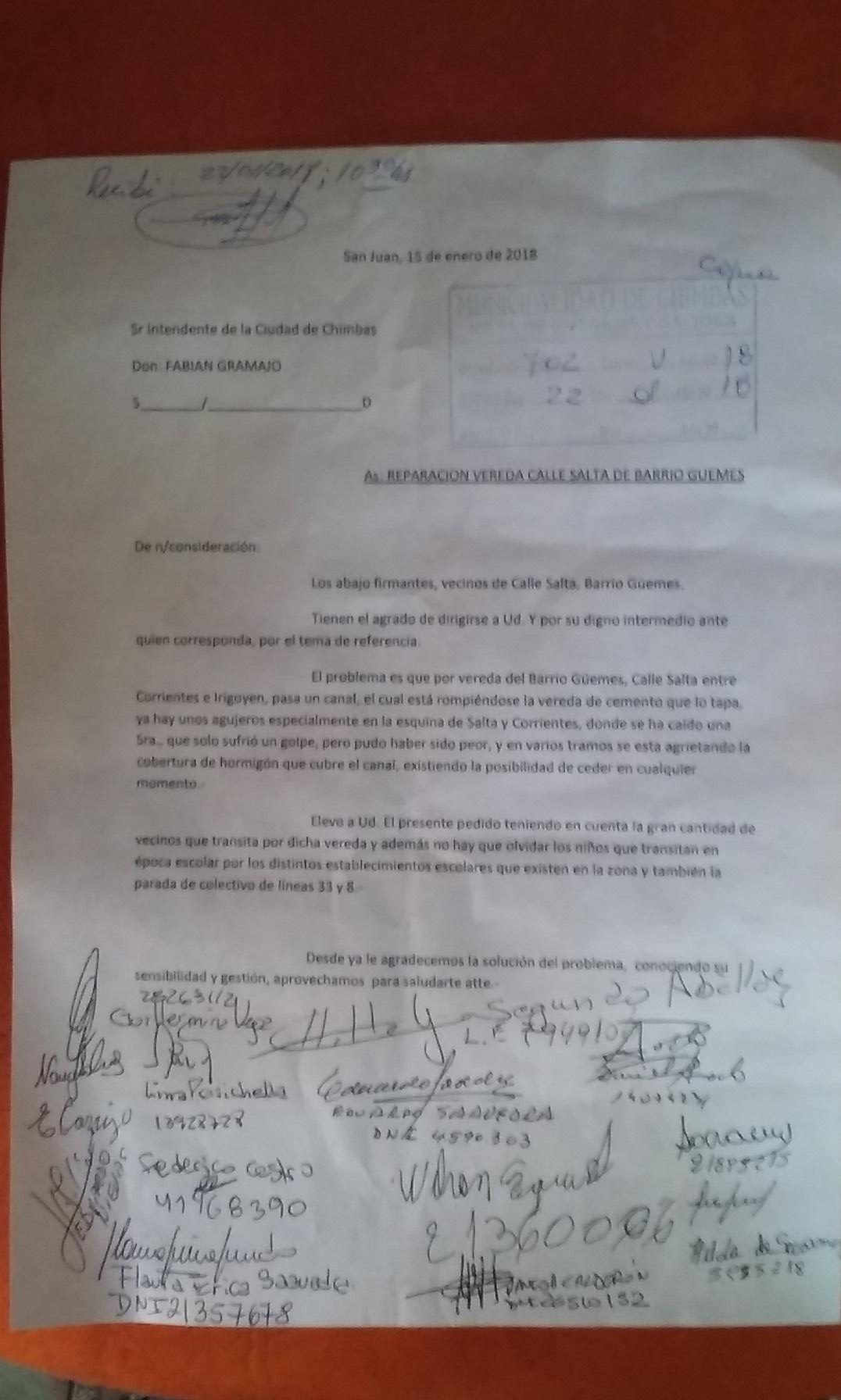 Un lector envió una imagen y el siguiente comentario: “Le hemos hecho llegar al Municipio nuestra queja por el tema veredas. Aquí adjunto nota”.