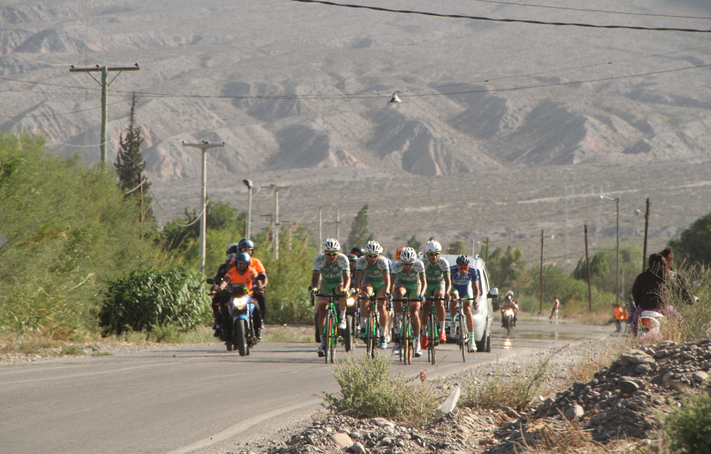 El grupo que lideró la competencia encara la calle Chacabuco (Costa Canal) hacía el norte detrás se observan los promontorios de los montes pocitanos. El trazado tuvo falsos planos pero no contó con desniveles que comprometieran las chances de los embaladores, como ocurrió con una definición de tres velocistas.