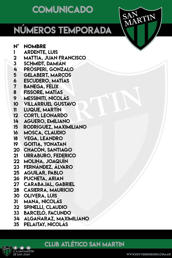 Diario de Cuyo | HOME | Noticias | San Martín ¿Quién se pondrá la 10 de San Martín? Conocé todos los números del plantel Por Redacción Diario de Cuyo 21/08/2017 · 0:00 Escuchar la noticia Escuchar la noticia Your browser doesn’t support HTML5 audio San Martín Superliga Ver los comentarios ›