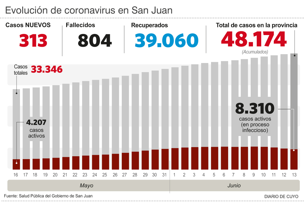 El Ministerio de Salud Pública informó que ayer se registraron dos decesos a causa de covid-19 y también 313 nuevos casos que elevaron el total a 48.174 desde que comenzó la pandemia. Los fallecidos son una mujer de 71 años, oriunda de Santa Lucía, internada en Clínica Santa Clara y una mujer de 57 años, oriunda de Chimbas, internada en el Hospital Marcial Quiroga.