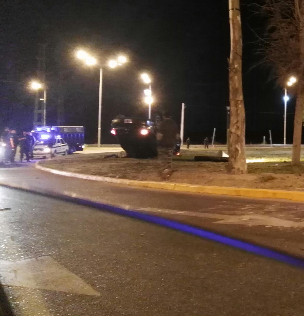 Un auto terminó volcado en la rotonda de Galindez y Ruta 60 durante la madrugada de este domingo. La Policía investiga que transitaba a alta velocidad.