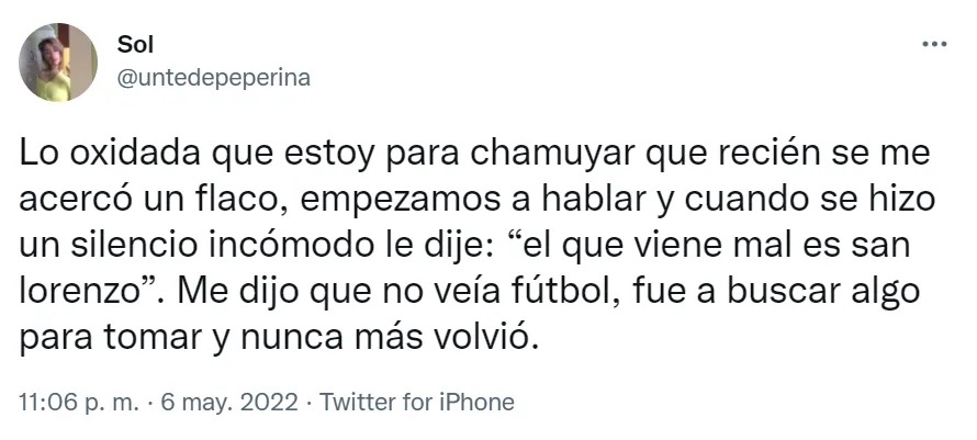 “Lo oxidada que estoy para chamuyar que recién se me acercó un flaco, empezamos a hablar y cuando se hizo un silencio incómodo le dije: ‘El que viene mal es San Lorenzo’”, contó.