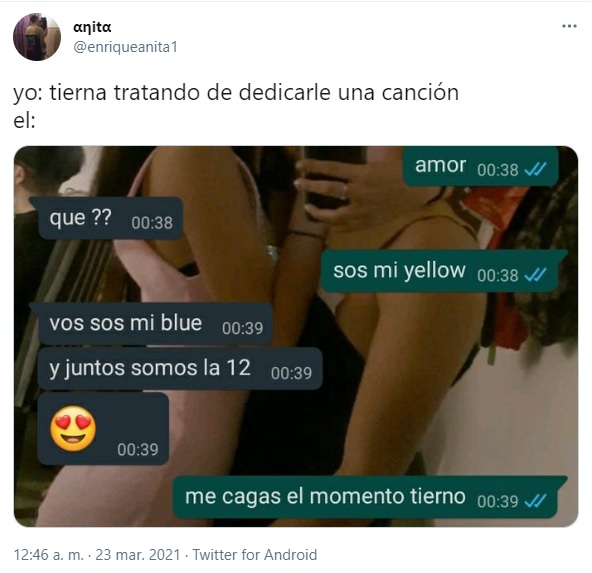 “Yo: tierna tratando de dedicarle una canción. El:”, escribió la cibernauta en su publicación. “Sos mi Yellow”, le expresa a su novio en referencia a la canción del grupo británico Coldplay. “Vos sos mi blue. Y juntos somos la 12”, le respondió él, haciendo referencia a los legendarios colores de Boca. Ella no tuvo más remedio que dejar en evidencia su frustración: “Me cagas el momento tierno”.