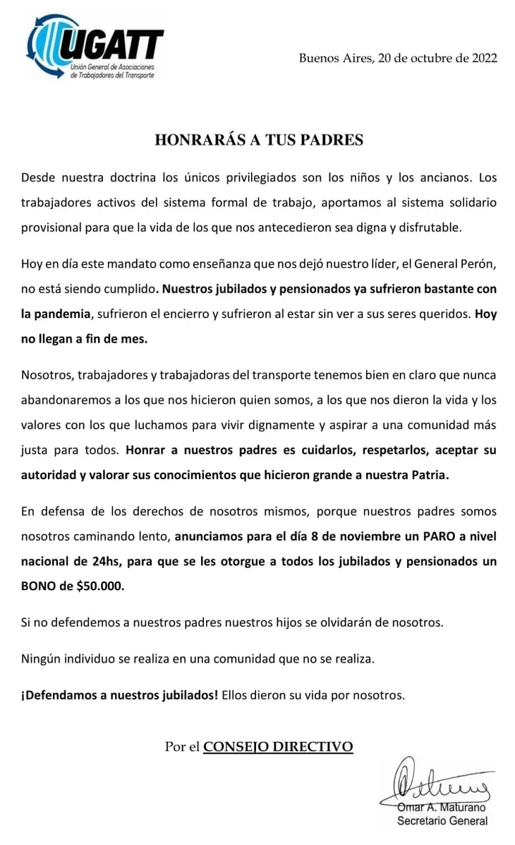 A través de un comunicado, la UGATT señaló: "Los trabajadores y trabajadoras del transporte, tenemos bien en claro que nunca abandonaremos a los que nos hicieron quién somos, a los que nos dieron la vida y los valores con los que luchamos para vivir dignamente, y aspirar a una comunidad más justa para todos. Honrar a nuestros padres es cuidarlos, respetarlos, aceptar su autoridad y valorar sus conocimientos que hicieron grande a nuestra Patria".