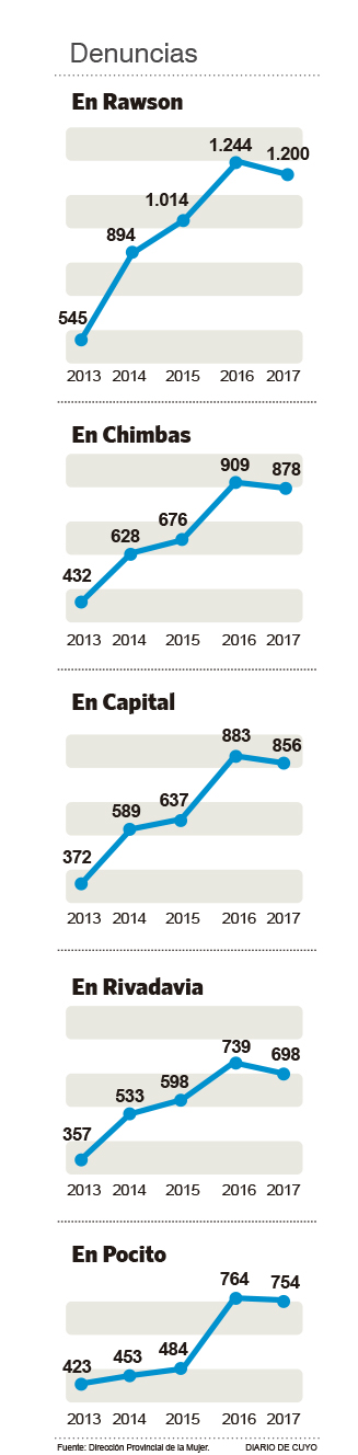 En el 2013 se registraron 545 casos de violencia de género en Rawson. En el 2014 fueron 894; en el 2015, 1.014; en el 2016, 1.240; y en el 2017, 1.200. Durante este lustro, lideró el ranking de hechos de maltrato a la mujer. El segundo lugar lo ocupó Chimbas con 3.523 casos, y el tercero Capital con 3.337. Luego se ubicó Rivadavia con 2.925 casos; y Pocito, con 2.878. Estos 4 departamentos también mantuvieron este puesto durante los 5 años. (Ver a parte).