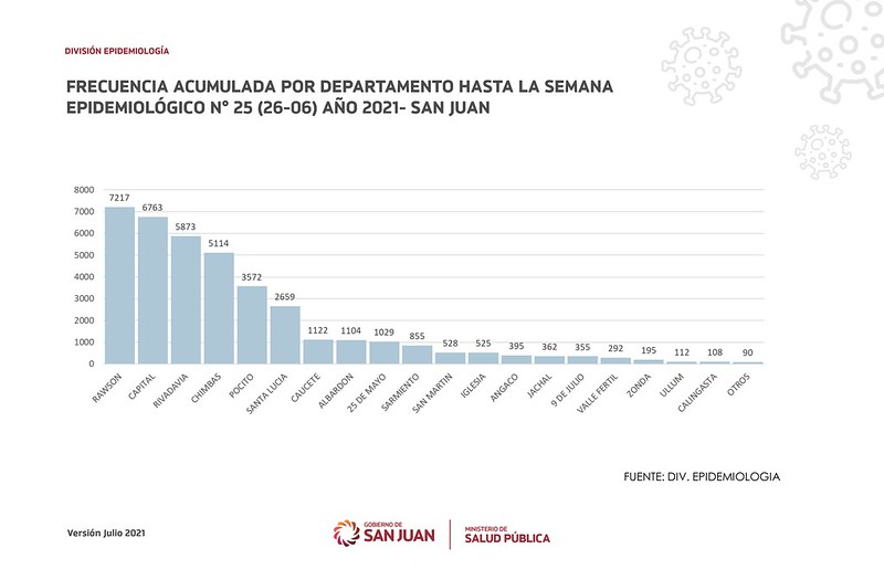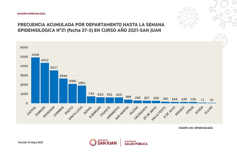Con 7.217 casos, Rawson creció en el acumulado respecto al reporte anterior un 66,6% (en el relevamiento hasta el 27 de mayo el total de casos era 4.332). Es decir que en un mes se registraron 2.885 contagiado y junio de 2021 mostró ser el mes de mayor crecimiento de positivos en lo que va del año.