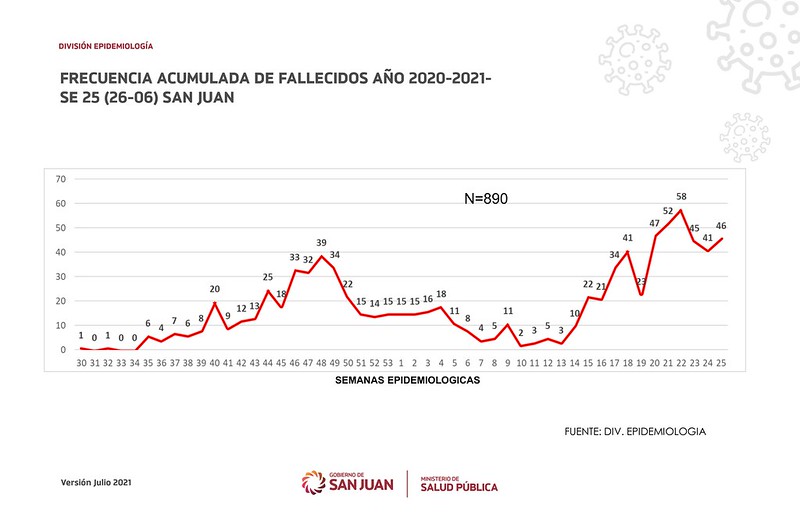 Estas últimas semanas también ocurre el triste record de ser las de mayor mortalidad relacionada a la pandemia, con el pico de 58 muertes en la semana del 5 al 12 de junio.