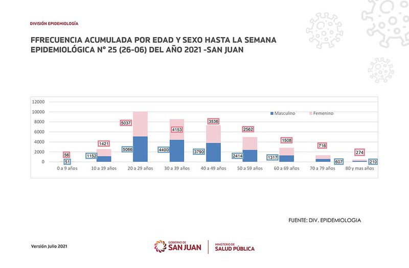 Respecto a la edad, el grupo de 20 a 29 años sigue siendo el de mayor cantidad de contagiados, con 10.103 haste el último reporte, seguids por los de 30 a 39 años,con 8553.