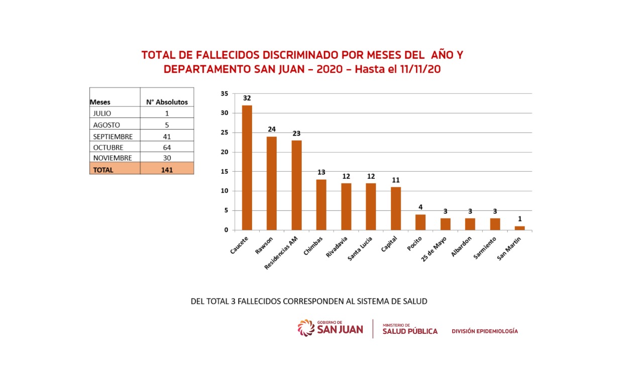Por otro lado, las autoridades dieron a conocer un informe sobre la cantidad de decesos registrados hasta ahora en la provincia como consecuencia del coronavirus, que suman 141, discriminados por departamentos.