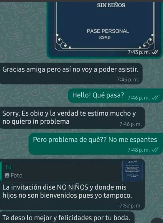 “Gracias amiga pero así no voy a poder asistir”, escribió luego de que la mandaran la invitación al casamiento. Posteriormente, la novia preguntó cuál era el problema, por lo que respondió: “La invitación dice ‘no niños’ y donde mis hijos no son bienvenidos pues yo tampoco. Te deseo lo mejor y felicidades por tu boda”.