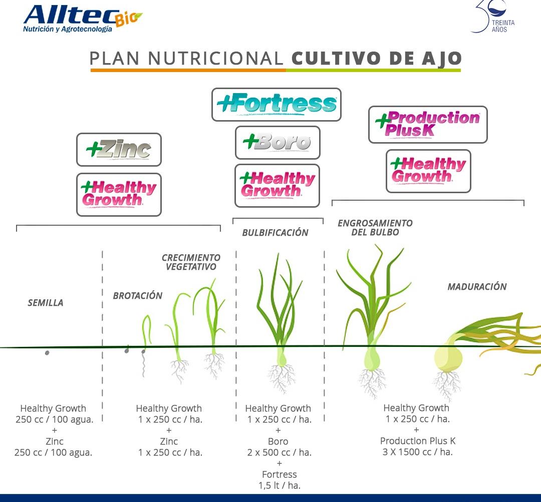 Desde los investigadores de Alltec Bio, y por intermedio que sus técnicos que llevan adelante los ensayos y experimentos de campo, aseguran que para ejemplificar, en particular en el cultivo de ajo, las aplicaciones dependen del estadio del cultivo y sus necesidades.