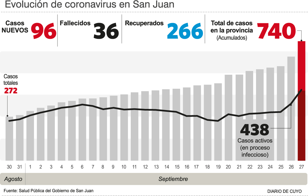 Ayer fue un día negro para San Juan. La pandemia dejó como saldo 4 personas fallecidas y otro récord de contagios. Se registraron 96 nuevos casos, la tercera cifra más alta en una semana. De este total, 65 corresponde al brote que hay en el Servicio Penitenciario Provincial, que a la fecha eleva el número de enfermos a más de 120, entre internos y penitenciarios. Estas cifras también grafican el peor fin de semana en la provincia con respecto al Covid-19: entre el sábado y ayer hubo un total de 7 muertes y de 155 nuevos contagios, llevando la cantidad de víctimas fatales a 36 y a 740 las personas que contrajeron la enfermedad desde que se desató la pandemia.