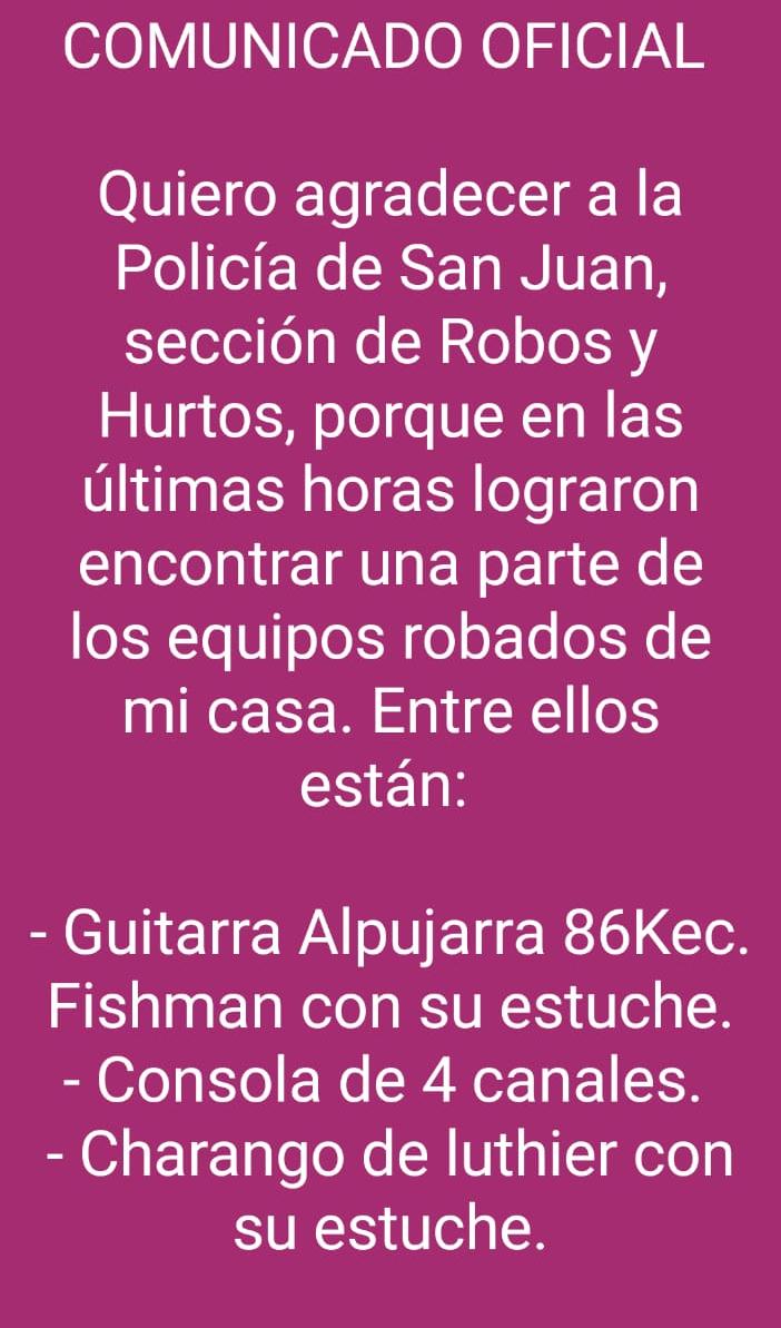Luego del hallazgo, Rodríguez agradeció en las redes sociales. "Quiero agradecer a la Policía de San Juan, sección Robos y Hurtos, porque en las últimas horas lograron encontrar una parte de los equipos robado", escribió y enumeró los elementos que recuperó.