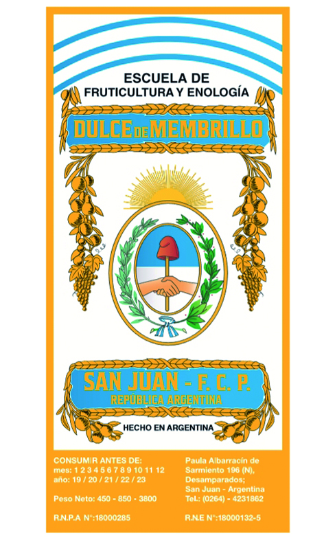 La idea es recuperar una etiqueta muy significativa y por ello Garrotti continúa explicando: "Capriotti, junto con el alumno Pablo Sebastián Gutiérrez estudiante avanzado y becario de investigación de Diseño Industrial de la UNSJ, a punto de recibirse; desarrollaron una etiqueta de membrillo rubio, haciendo gala de aquellos envases y aprovechando la fecha tan particular como fue el último aniversario de la fundación de la Escuela, en la que se reunieron cinco promociones".