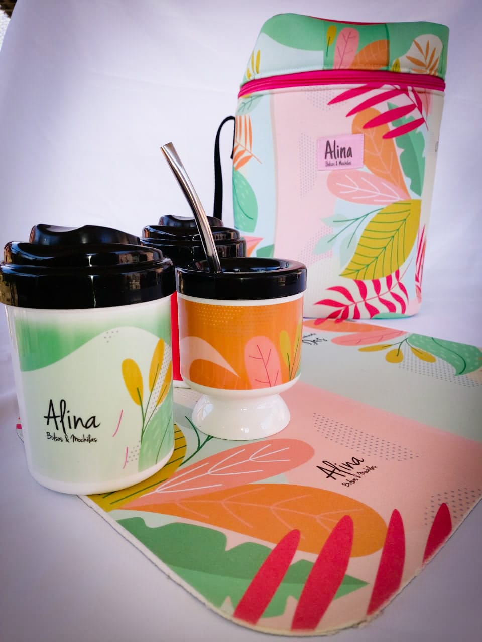 Bajo la marca Alina Bolsos y mochilas, ella propone distintas líneas de kit de mate (es de neoprene sublimado, de 34 centímetros de alto y 28 de largo, incluye el equipo de mate con los mismo motivos por 1.700 pesos), bolso matero (1.200 pesos), además de neceser, cartucheras, fundas para notebooks, bolsos y bolsillos organizadores para el auto.