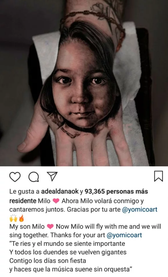 "Ahora Milo volará conmigo y cantaremos juntos. Gracias por tu arte", escribió René, de un modo poético, en la foto que subió a Instagram, en la que lució el especial tattoo de la carita de su niño, quien en pocos días cumplirá 4 años.