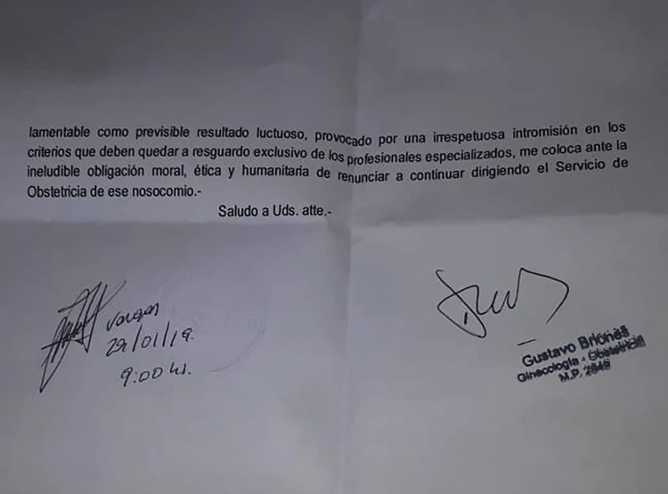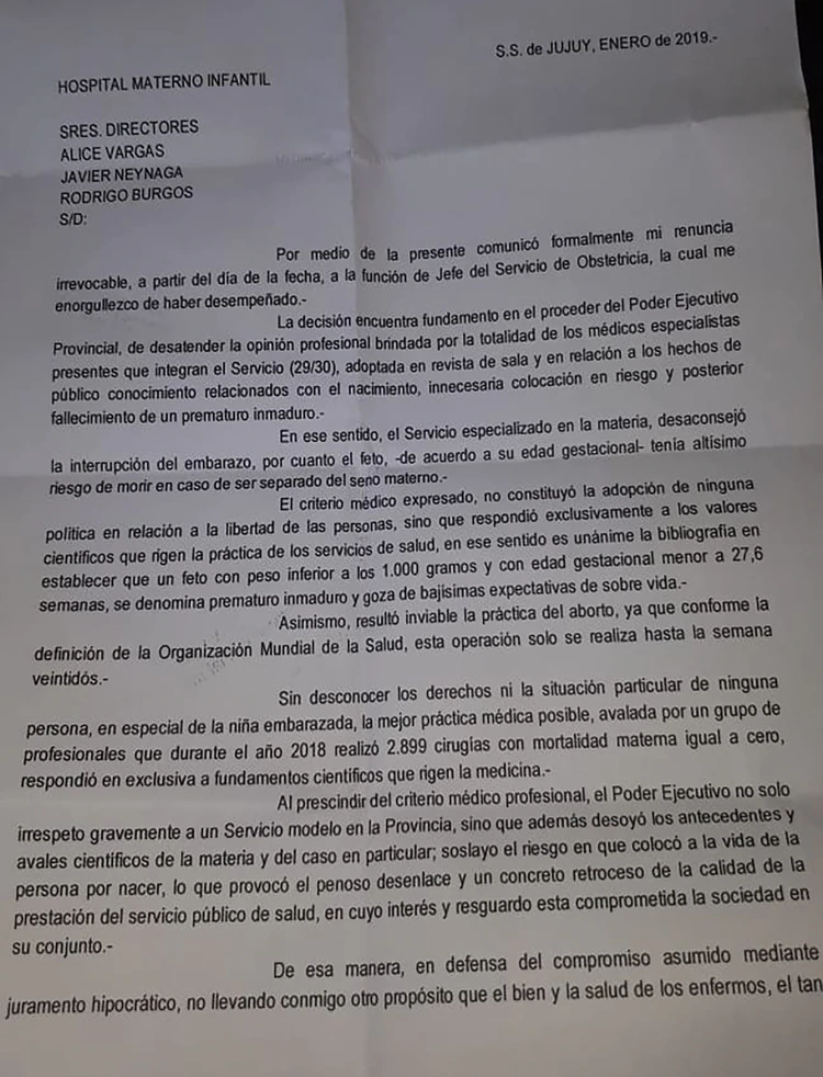 Briones presentó un escrito para dar a conocer su decisión y apuntó al Poder Ejecutivo de la provincia de Jujuy, es decir, al gobernador Gerardo Morales, por "desatender la opinión profesional brindada por la totalidad de los médicos especialistas".