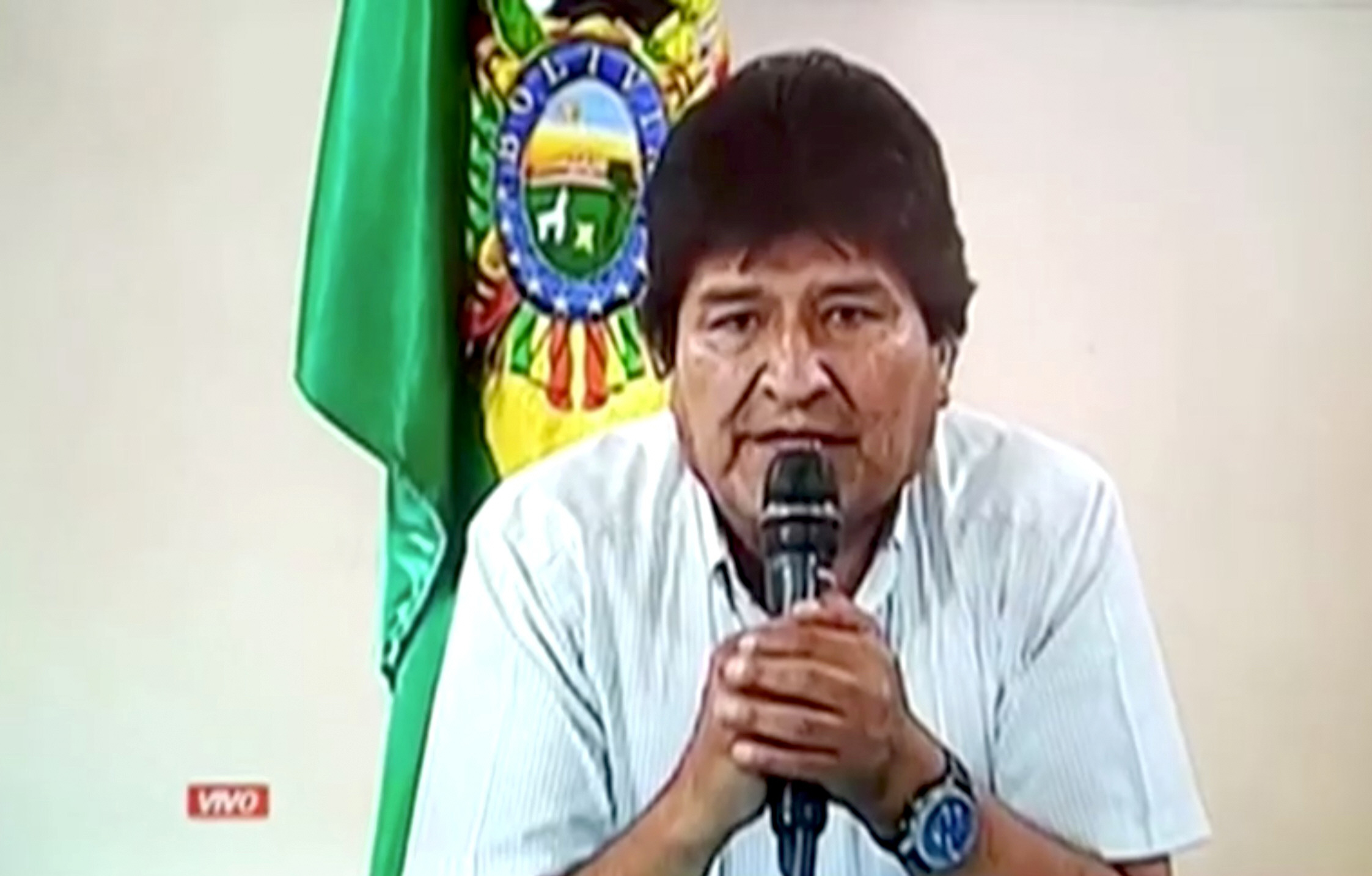 En un video desde algún lugar indeterminado, Evo Morales apareció en la televisión para anunciar su renuncia, tras lamentar un "golpe cívico" y que la Policía se hubiera replegado a sus cuarteles en los últimos días.