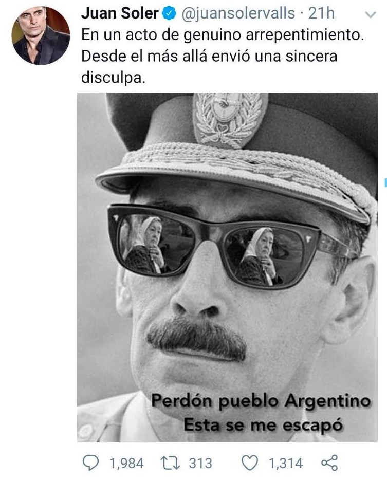 Juan Soler se convirtió en tendencia este jueves en Twitter pero no por su carrera actoral, de fugaz y efímera trascendencia en la televisión argentina en la década del 90’, sino por un hecho que generó repudio e indignación en las redes sociales: publicó una foto del genocida Jorge Rafael Videla con la referente de Madres de Plaza de Mayo, Hebe de Bonafini, y el texto “perdón pueblo argentino, ésta se me escapó”.