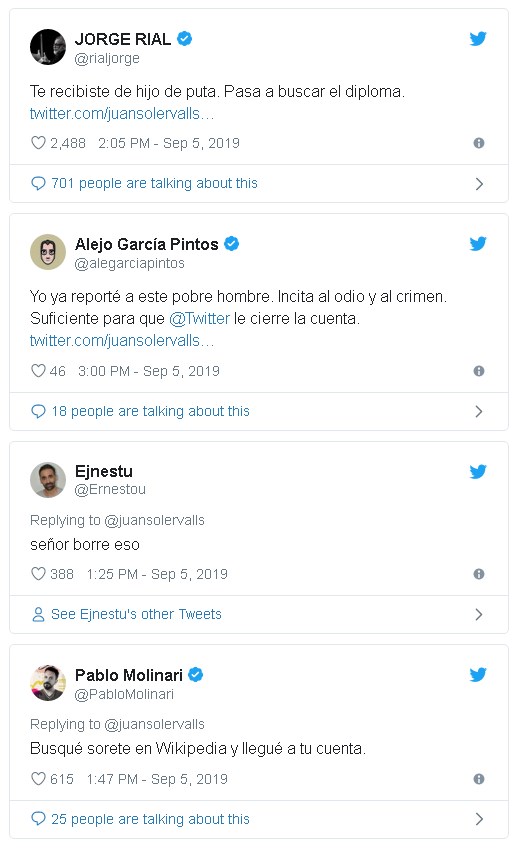 El posteo del actor, ferviente defensor de Mauricio Macri, causó mucha bronca en las redes sociales y, pese a que muchos lo denunciaron, él no se desdijo y mantuvo lo escrito, publicando en respuesta varios tuits más donde se defendía acusando a Hebe de “delincuente desestabilizadora” y reclamando prisión para la referente en materia de Derechos Humanos.