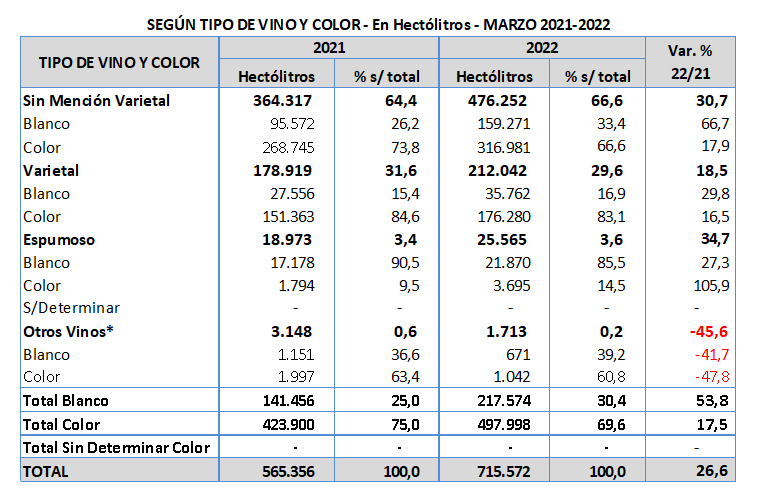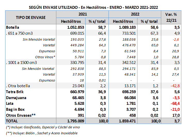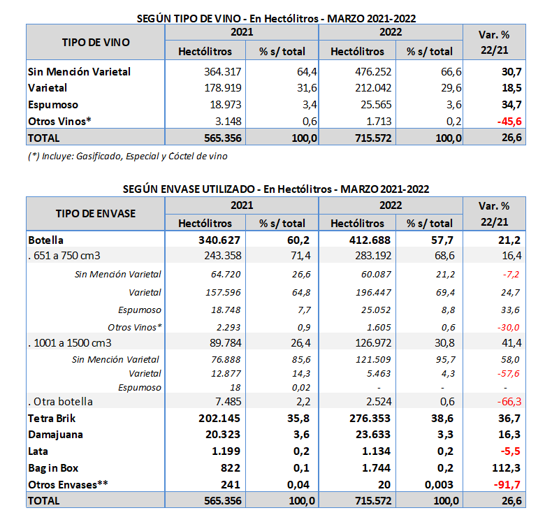 El INV informó que con valores positivos en todos los tipos de vinos, colores y una recuperación muy fuerte de casi todos los envases, marzo 2022 marcó despachos por 71,5 millones de litros de vino, el mejor registro de los últimos 5 años.