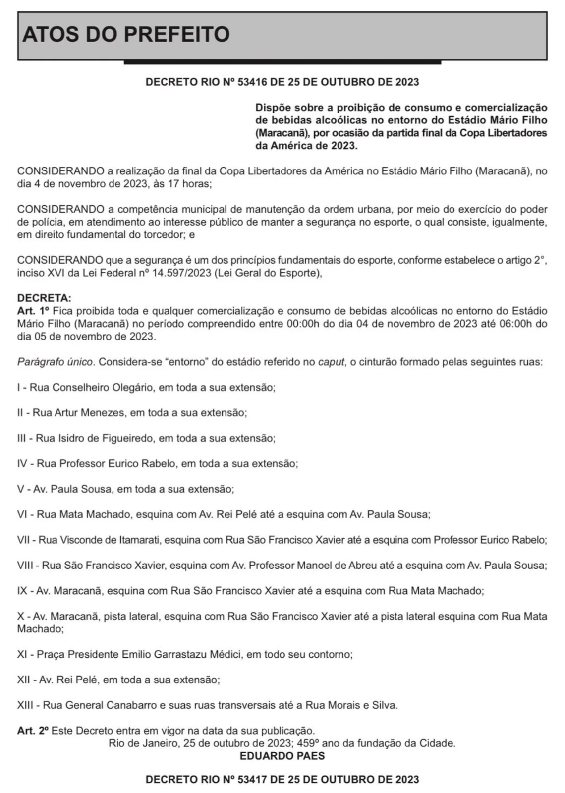 Prevé la prohibición del consumo y venta de bebidas alcohólicas en los alrededores del Estadio Mário Filho (Maracanã), con motivo del partido final de la Copa Libertadores de América 2023.