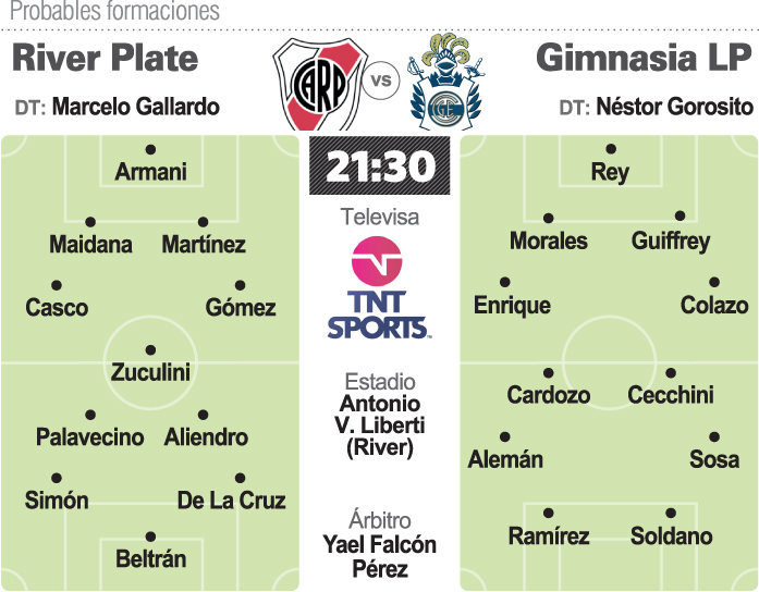 En el "Millonario" ingresaría en la defensa Héctor David Martínez por Javier Pinola en la zaga, mientras que en Gimnasia no jugará el desgarrado Matías Mellusso y lo reemplazará Nicolas Colazo, mientras que en la zona media del ‘Lobo’ ingresará Emanuel Cecchini por Manuel Insaurralde.