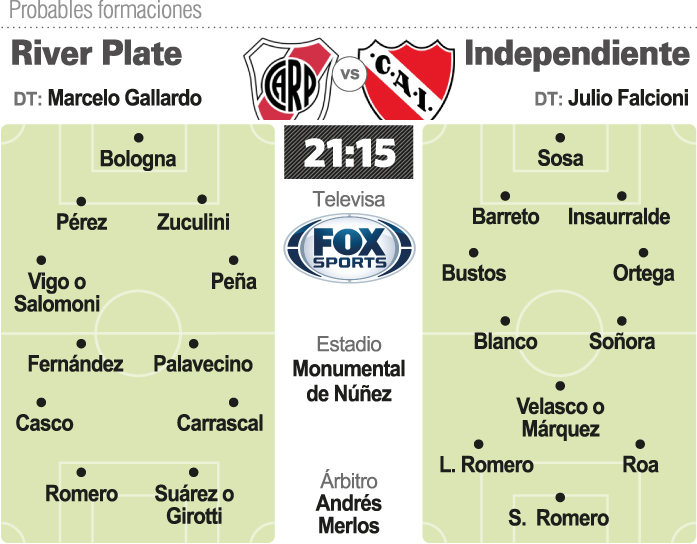 El clásico se jugará a partir de las 21.15 en el estadio "Monumental" de Núñez y será arbitrado por Andrés Merlos. El equipo dirigido por Marcelo Gallardo tiene 17 puntos con una serie de tres triunfos, el último sobre Sarmiento, en Junín, por 2-1, y un empate, mientras que los de Falcioni están expectantes con 18 unidades y el ánimo alto tras haber goleado a Colón (3-0).