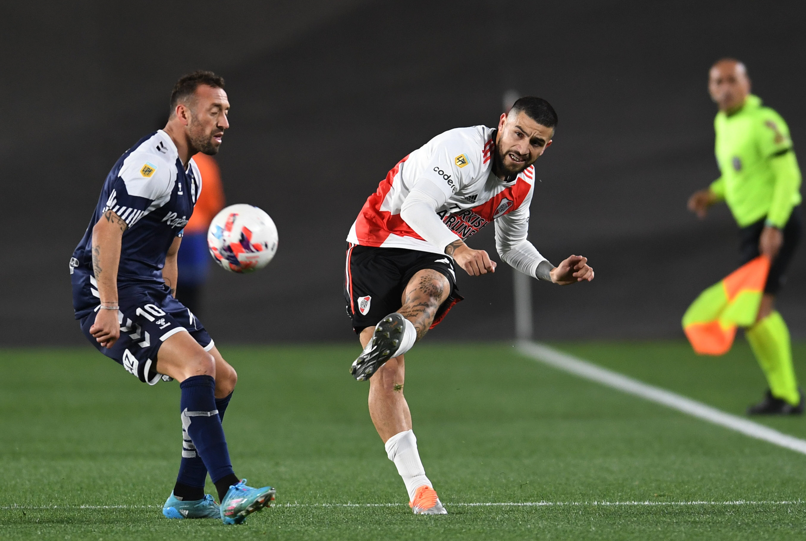 Al ataque. Elías Gómez, de River, ensaya un tiro al arco ante la marca de Brahian Aleman, de Gimnasia. El Millonario dio señales positivas en su juego y se quedó con los tres puntos.