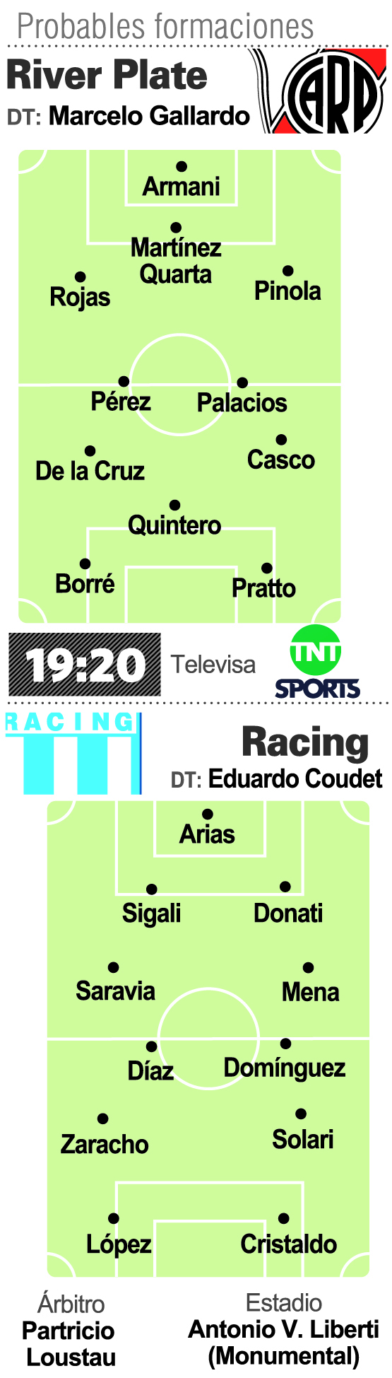 Racing afrontará hoy uno de los compromisos más riesgosos en su camino al título cuando visite a River, actual campeón de América, que tiene escasas chances para sumarse a la lucha por ser campeón pero que buscará cortarle la buena racha al líder.