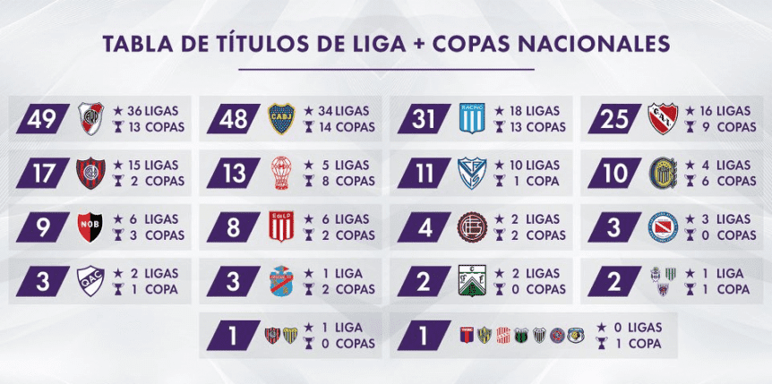 Vale aclarar que si a los títulos locales oficiales se le suman las copas internacionales, el equipo más ganador del fútbol argentino es Boca, que suma 70 conquistas en total. En segundo lugar aparece el Millonario, con 67.