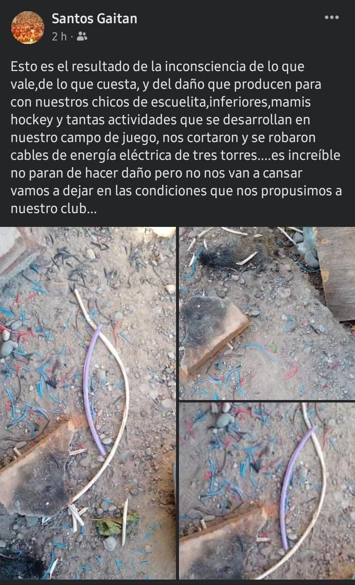 "Lo que se llevaron son los que proveen de energía eléctrica las tres torres de la luz, que con mucho sacrificio más la ayuda de la Secretaría de Deportes pudimos instalar. Había quedado hermoso el lugar y la obra permitía las prácticas de los chicos de la escuelita, de las inferiores y del grupo de mamis hockey", comentó Santos Gaitán, dirigente del club, quien además denunció el hecho en las redes sociales.