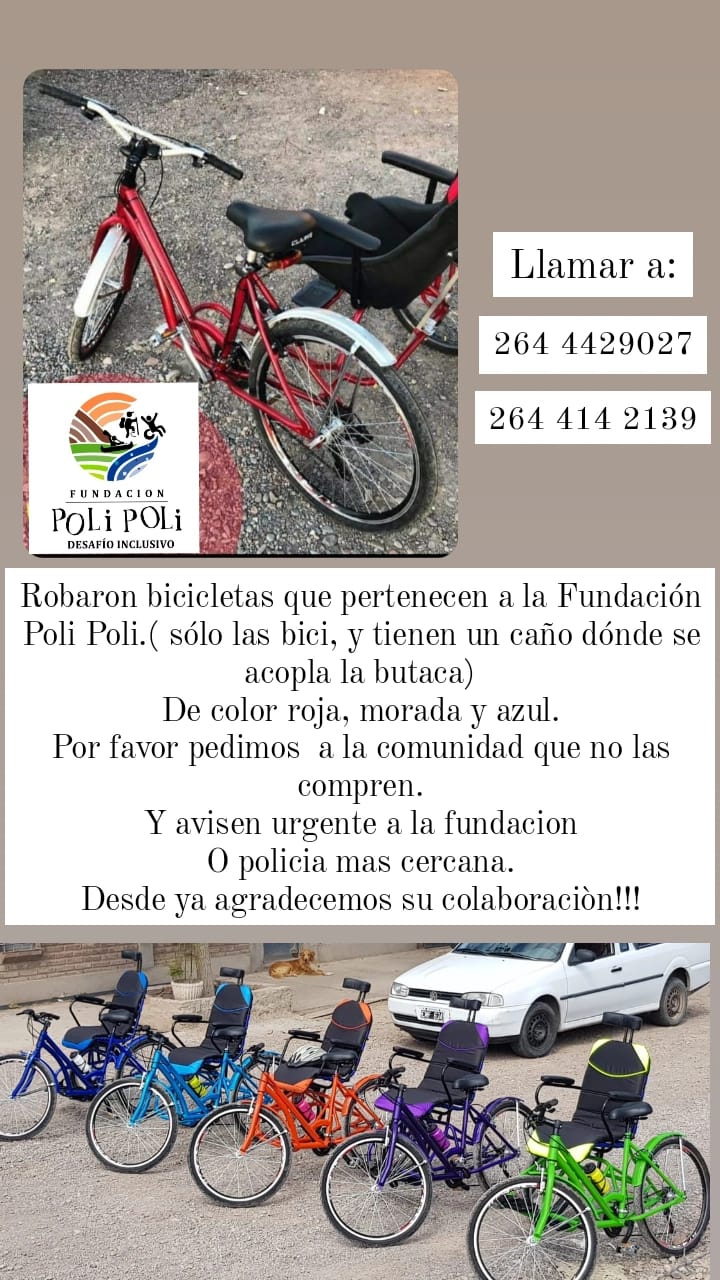 La Fundación Poli Poli se encontró este jueves con la terrible noticia de que les habían robado tres bicicletas que llevan adaptadas una silla para trasladar a personas con discapacidad. En diálogo con este medio, una de las integrantes de la fundación, que contiene y realiza actividades de recreación para personas con discapadidad y sus familias, dijo que los delincuentes habrían ingresado por el jardín de una vivienda de Santa Lucía y del garage se llevaron las tres bicicletas.