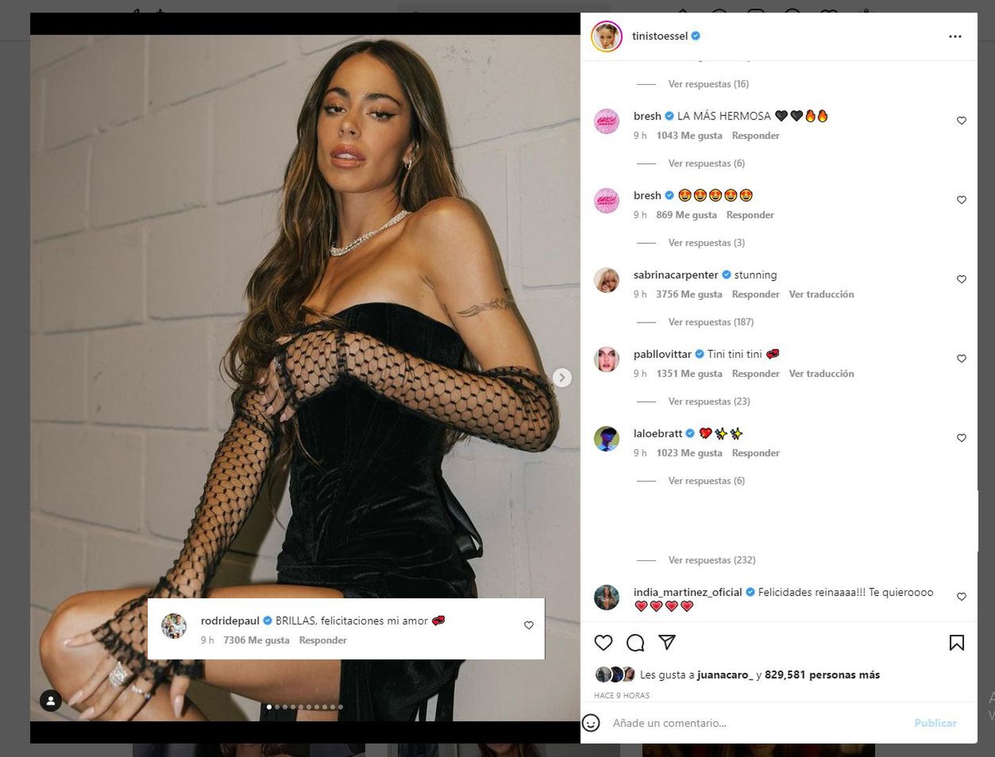 La respuesta de Tini se viralizó rápidamente. ¿Realmente está enamorada de De Paul? No se sabe, pero el jugador surgido en Racing se encargó de decir lo suyo: “BRILLAS, felicitaciones mi amor ”, le escribió en un posteo que ella publicó para agradecer por la premiación a su tema “Miénteme”.