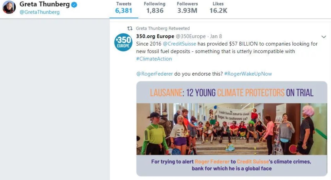 La activista retuiteó un mensaje de la campaña #RogerWakeUpNow ("Roger, Despierta Ya"), que tiene como objetivo que el suizo deje de ser la cara visible del banco. "Desde 2016, Credit Suisse porporcionó U$S57 mil millones a compañías que buscan nuevos depósitos de combustibles fósiles", cuestiona el texto que compartió Greta en sus redes. Y se preguntó: "Roger Federer, ¿Vos lo respaldás?".