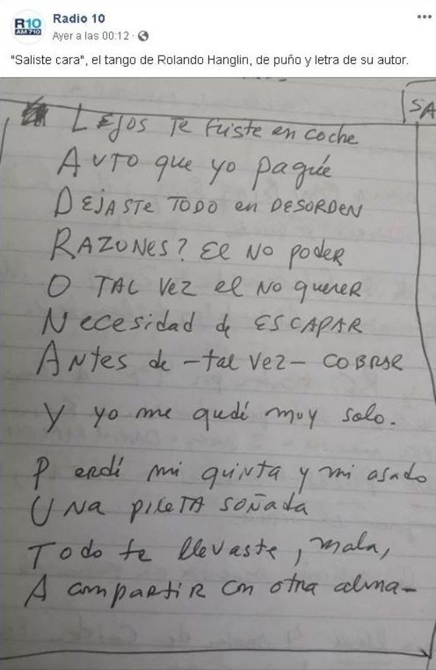 Y agregó: “Le dediqué un tango que estoy esperando que unos amigos le pongan música. El tango ese es para esa mujer”. En la letra del tema se puede leer como Hanglin tilda de “ladrona y puta” a la mujer que le robó la plata, algo que molestó a Carla Conte.