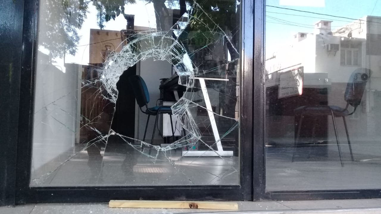 La puerta de vidrio con un agujero, todo astillado, en la parte inferior. El hueco, de no más de 30 centímetros de diámetro y un bastón de madera de pino junto a ella, en el piso. Con ese panorama se encontró este martes en la mañana Julio Aranda, el responsable de la obra social OSPIDA, que nuclea a los empleados gráficos en la provincia.