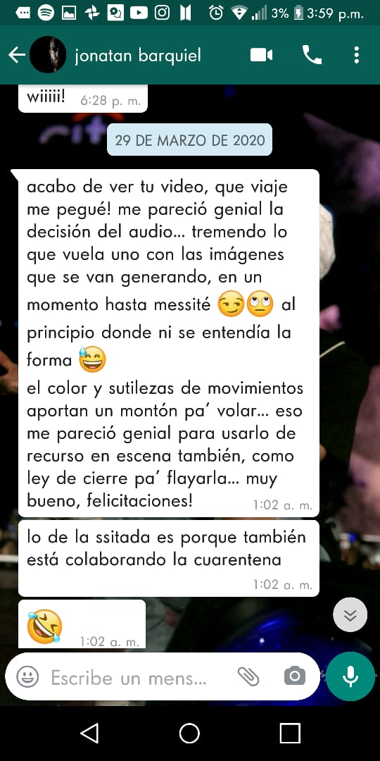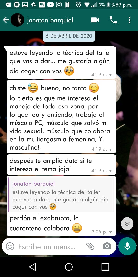 "Obvié esa parte y le respondí de las cuestiones técnicas", indicó. Y por un taller de entrenamiento físico que ella iba a dictar, comenzó él una seguidilla de mensajes que la llevaron a sentirse acosada. Lo habló ella con una amiga que integra la comunidad ‘Colectiva Trabajadoras Escénicas’ , donde encontró contención y se fue enterando de otros casos.