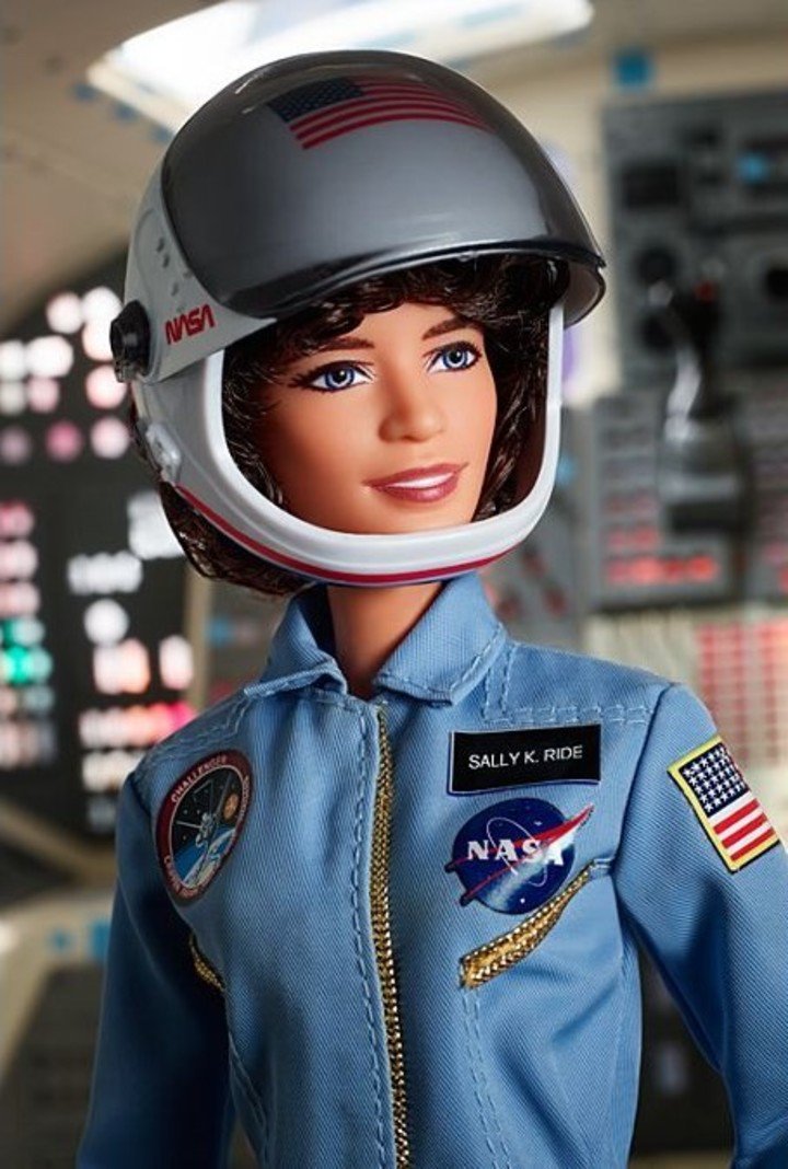 La muñeca de Sally Ride celebra a la primera mujer estadounidense en volar en el espacio, una hazaña que logró en 1977 a bordo del transbordador espacial Challenger. Naturalmente, ella usa un traje de vuelo azul de la NASA y viene con un casco extraíble y auriculares.