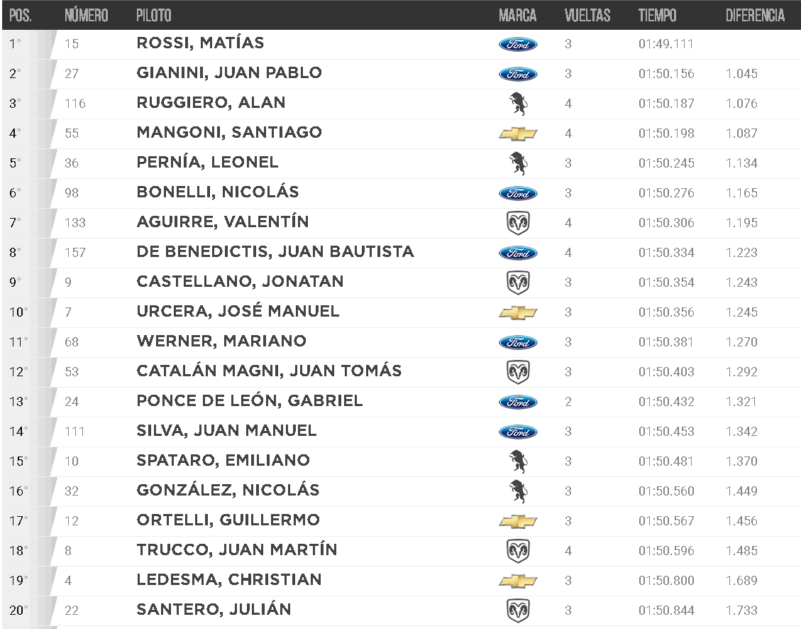 Alan Ruggiero, ganador de las dos últimas carreras, escaló hasta el tercer puesto con su Torino tras quedar a 1s076 de la punta, mientras que Santiago Mangoni fue el mejor usuario de Chevrolet en el cuarto puesto, a 1s087 del más veloz. En tanto que el Torino de Leonel Pernía se colocó quinto. Más atrás, Nicolás Bonelli (Ford), Valentín Aguirre (Dodge), Juan Bautista De Benedictis (Ford), Jonatan Castellano (Dodge) y José Manuel Urcera (Chevrolet) ocuparon de la 6ª a la 10ª plaza.