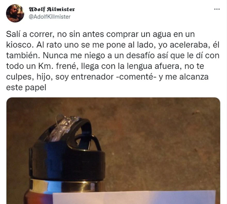 “Salí a correr, no sin antes comprar un agua en un kiosco. Al rato uno se me pone al lado, yo aceleraba, él también”, relató en su perfil social. Al principio pensó que el hombre lo estaba desafiando a una carrera de velocidad, y no dudó en aceptar: “Nunca me niego a un desafío así que le di con todo un kilómetro”, aseguró.