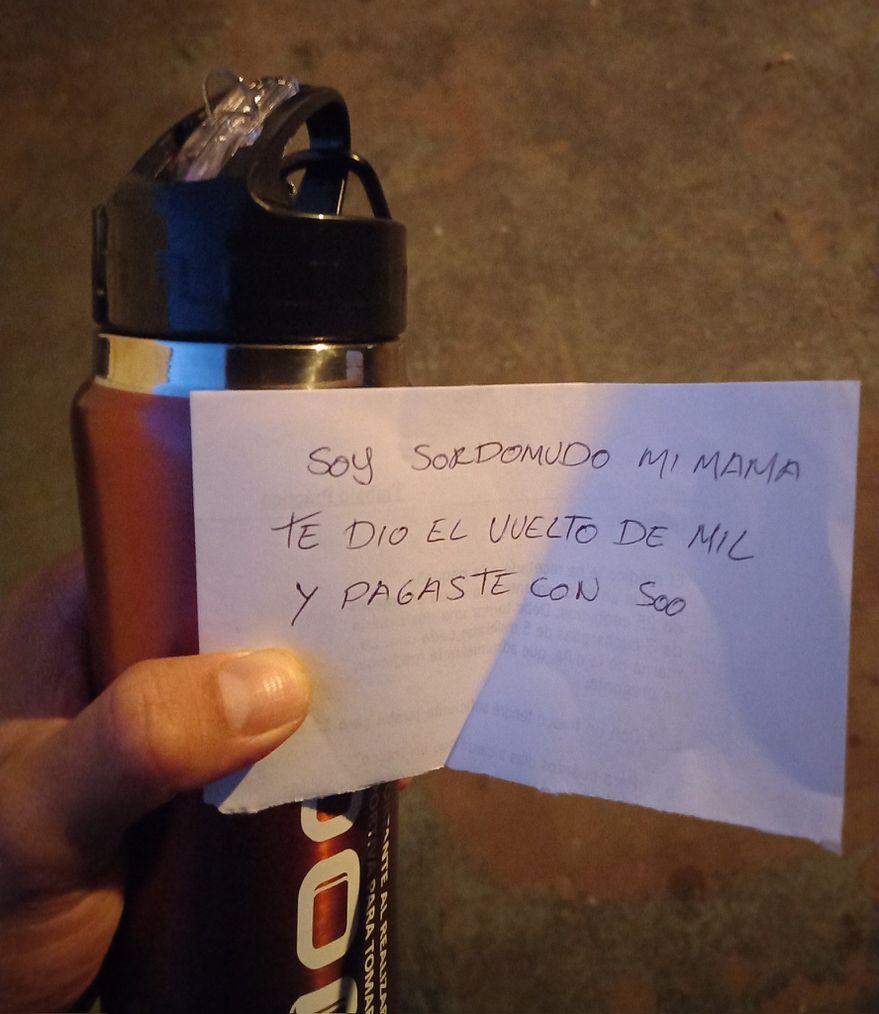 “Soy sordomudo, mi mamá te dio vuelto de mil y pagaste con 500″, decía el inesperado mensaje. Ahí fue cuando advirtió que la intrigante persecución la había protagonizado el hijo de la dueña del kiosco donde había comprado la botella de agua, porque le había dado mal el vuelto.